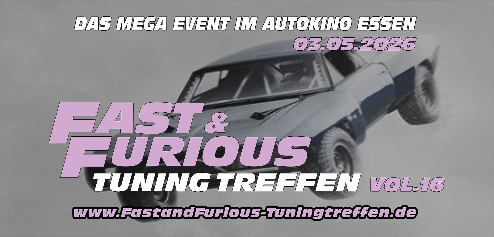 Sei am 03.05.2026 beim Fast & Furious Tuning Treffen VOL.16 (inkl. Filmvorführung FAST & FURIOUS TEIL 7) im Autokino Essen dabei und erlebe wieder eins der unvergesslichen, markenoffenen Tuningevents mit einem sensationellen Rahmenprogramm.