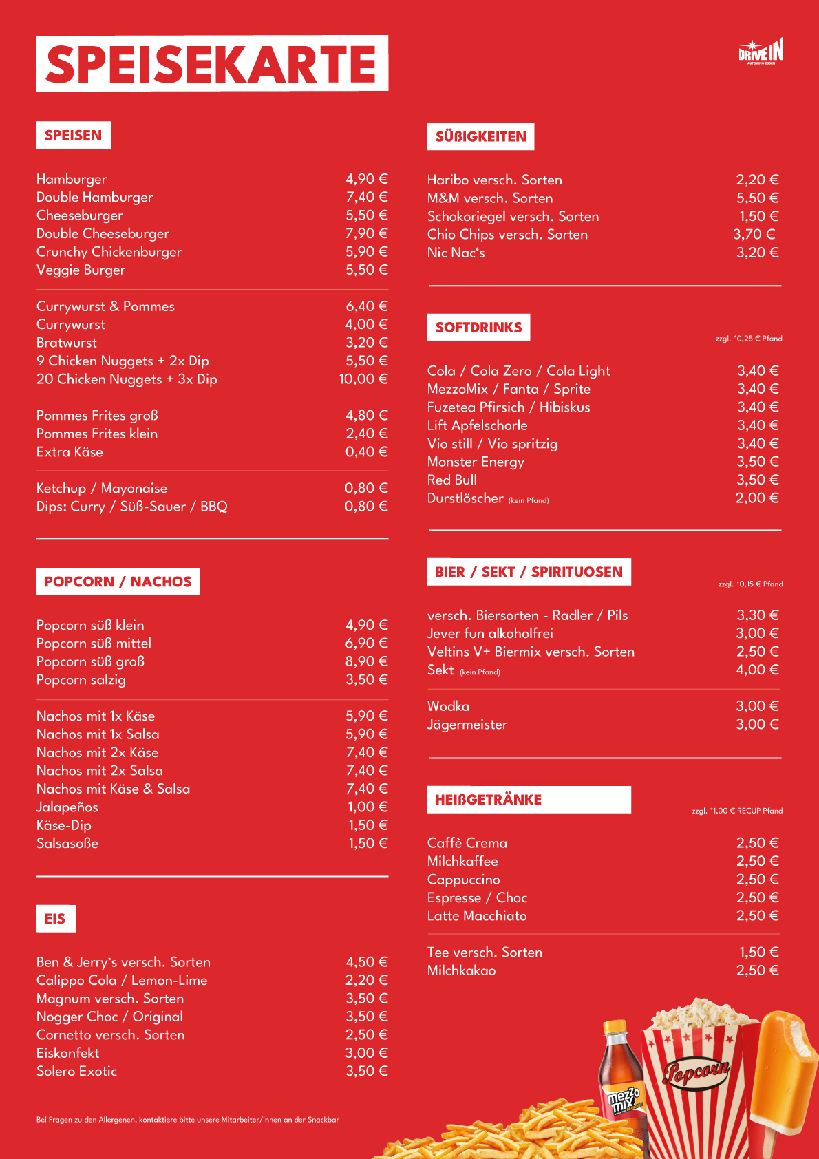 Auch für Snacks, Speisen und Getränke ist gesorgt! In unserer Snackbar im Retro-Stil erhältst Du neben American-Style Burgern und leckerem Fingerfood auch Popcorn, Nachos und Kuscheldecken für ein Autokinoerlebnis mit Wohlfühlfaktor. Hier findest Du unsere Speisekarte.